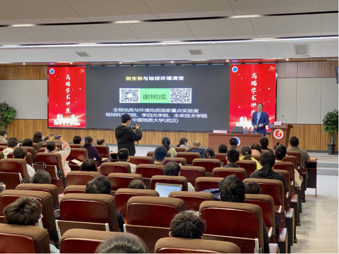 随后谢树成院士在图灵报告厅做了题为“微生物与地球环境演变”的学术报告。谢院士循序渐进、深入浅出的介绍了地球演化进程中地质微生物的重要性和挑战,提出利用地质脂类来识别岩石保存的地址微生物功能群的新方法。并以湖北神农架大九湖湿地作为典型介绍了一系列反映干湿变化的微生物新指标,提出消除碳排放的泥炭藓和共生微生物的恢复和保护策略;谢院士还在目前新冠病毒大流行的背景下介绍了地质病毒与古气候的关系,指出地质病毒未来重要突破方向。谢院士就老师们和同学们的提问进行了详细解答,并与师生分享了他在学科建设、人才培养等方面的宝贵经验。