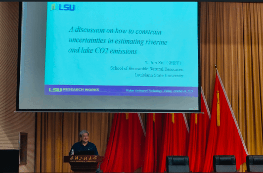 报告首先介绍了湖泊水-气界面CO2排放量的估算,指出了目前存在的波动范围较大(0.22~0.81 Pg/年),这主要是由于存在许多不确定因素,导致难以准确估算湖泊CO2的排放量。Y. Jun Xu教授团队选择密西西比河作为研究对象,考察了城市化、气体交换系数、水文连通性以及采样时间对河流CO2排放估算的影响。研究发现,人类活动、河道几何形状的复杂性和整个景观的流动条件都会增加对河流CO2排放估算的不确定性。此外,研究表明,每日上午10:00时,河流CO2浓度最接近当日CO2浓度的平均值。因此,建议未来标准化pCO2测量研究的时间,以便实现CO2排放研究在全球不同地理区域和季节之间的可比性。会议最后,Xu教授详细回答了与会者提出的问题。