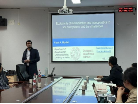 报告中,Fazel A. Monikh研究员从什么是微塑料和纳米塑料展开简要介绍,提出土壤环境中微塑料/纳米塑料分离和鉴定过程中存在的挑战性问题,结合自身研究工作,向与会师生深入介绍了高效提取土壤中纳米塑料的四步法;随后,Fazel 研究员介绍了环境中PS和PVC等典型微塑料在土壤动物和植物中的迁移转化过程,以及不同微塑料在植物根系和茎叶的累积过程中存在的差异性;最后,Fazel深入讲解了基于Gd离子标记的塑料颗粒在泥炭藓中的转运过程、及其对泥炭地生态系统细菌群落的影响。会后,Fazel针对土壤环境中微塑料的鉴定及其生态环境效应等前沿问题与在场师生进行了深入交流,并期望与我校科研人员开展进一步的科研合作,特别向参会的研究生介绍了东芬兰大学和帕瓦尔大学等欧洲知名大学的留学政策,鼓励研究生去欧洲高校进行进一步深造。
