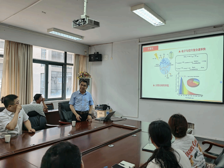 孔海霞对王传义教授的到来表示了热烈欢迎,并简要介绍了王教授的研究领域及学术成果。随后王传义教授做了题为《缺陷微结构调控与光催化增强效应》的报告以太阳能为驱动的光催化技术为核心,指出其大规模工业化应用的两大制约因素,即材料的光响应范围和光子利用率,这两大因素与材料的结构和表界面过程紧密相关。王传义教授及其团队在光催化材料缺陷微结构调控及分子水平上理解其表面界面过程方面开展了一系列工作这些工作为我们理解和应用缺陷微结构调控增强光催化提供了借鉴。