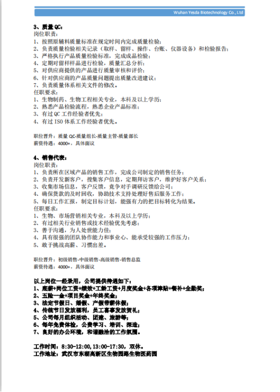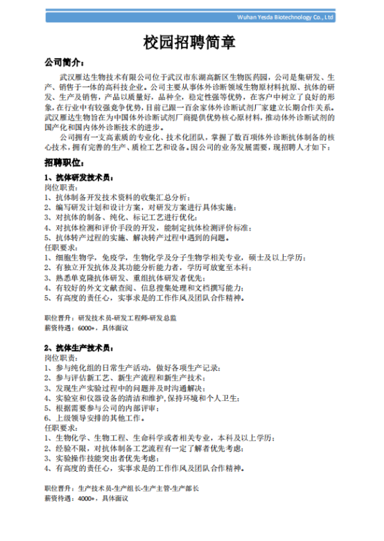 武汉雁达生物校园招聘简章