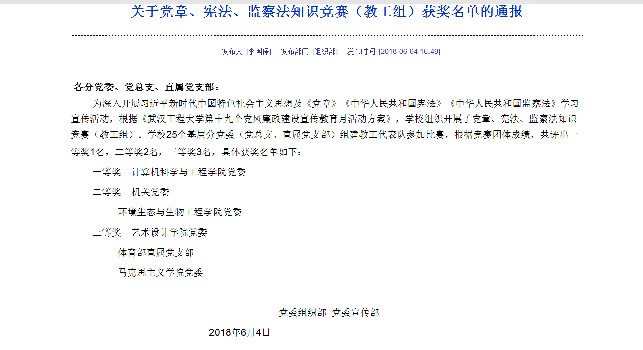 (通讯员 马科)5月31日中午,学校第十九个党风廉政建设宣传教育月学《中国共产党章程》、《宪法》、《监察法》知识竞赛(教工组)在计算机大楼214顺利举行。我院由院党委书记刘汉红带队,党务干事马科,研究生党支部书记陈功参加比赛,根据学校党委组织部、党委宣传部关于知识竞赛成绩的通报:我院在学校25个基层分党委(党总支、直属党支部)组建教工代表队中荣获二等奖。