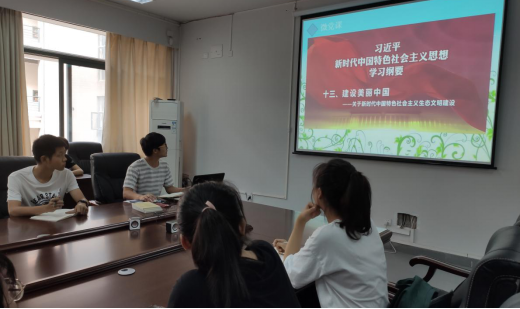 在学生党员讲微党课、学原著环节,彭俊、罗愿聪两位同志分别分享了自己学习《习近平新时代中国特色社会主义思想学习纲要》(以下简称《学习纲要》)感悟。彭俊同志从《学习纲要》中“建设美丽中国”一章入手,以图文结合方式分享了习近平总书记关于生态文明建设方面的重要讲话。罗愿聪同志则向大家介绍了习近平新时代中国特色社会主义思想的来源背景和基本内容,以近期的香港事件探讨了当代青年爱国爱党的重要性,并提出身为党员更应该以身作则,主动学习习近平新时代中国特色社会主义思想,努力培育和践行社会主义核心价值观。