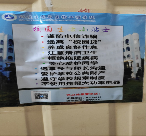 为增强学生的安全意识,做必要的安全提醒。学院为新生宿舍张贴了安全小贴士,方便同学们了解了必要的安全常识,努力打造“平安校园”,提高新生的安全意识和自护能力,营造安全健康的育人环境。