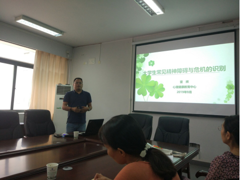 会议就近期工作做了布置,特别就假期前后学生安全教育和“四难”学生的关注进行强调,要求各班班主任要牢固树立风险责任意识和底线思维,确保学校各项要求落实到位。会议邀请到学校心理健康中心雷辉老师对各班班主任和心理委员进行培训,就大学生常见的心理问题识别和相应干预进行讲解。
