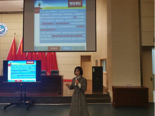 在考风考纪教育环节,陈朝娟结合真实案例进行分析,解读了学校的相关规章制度,要求我院全体学生都严格遵守学校和学院的纪律规定。认真复习备考,严肃考风考纪,严禁触碰违纪高压线。她还要求同学们在期末期间加强《学生手册》中各项规章制度的学习,各班在期末前集中召开《学生手册》主题学习班会。