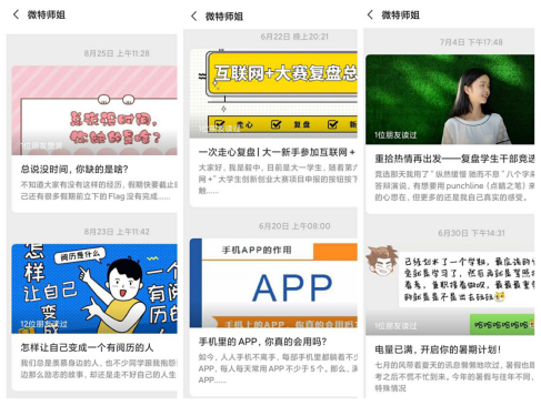 2020年6月起,团队成员通过精心设计和编辑制作,发布多篇微信公众号原创推文,助力大学生暑期居家学习和健康成长,为大学生提供学业指导、生涯规划、提升技能等,依托微信公众号,团队成员撰写了《大学生如何平衡学习和工作?教你4个小Tip!》《一次走心复盘|大一新手参加互联网+大赛》、《三十而已,二十何惧未来?》、《答应我,好好照顾身体》、《怎样让自己变成一个有阅历的人》、《总说没时间,你缺的是啥?》等学生喜爱的20余篇网文,为了学生提供思想引领、创新创业大赛介绍、学习和生活的平衡、职业规划等方面的指导。