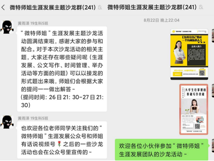 实践团队还建立了社群和针对大学生常见的思想困惑展开主题研讨。围绕“如何面对大学里的不公平”“如何快速找到自己想要的资源”“学生活动占用我太多的时间怎么办”等话题展开讨论,激发和锻炼大学生的独立思考、解决问题的能力。
