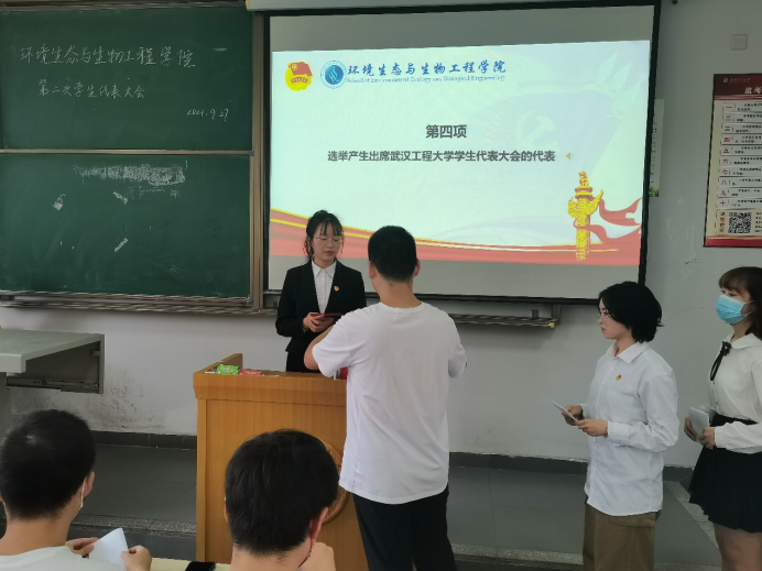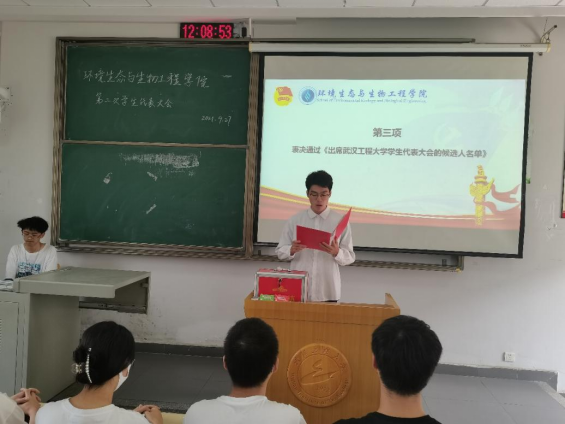 黄仁华宣读学院出席武汉工程大学第六次学生代表大会的候选人名单,共计9人,他们是:王源、于红艺、黄雨泽、黄德永、方稳、刘麒、凌东森、刘潇潇、向梦杰。并向在座的学生代表一一介绍候选人的相关情况。
