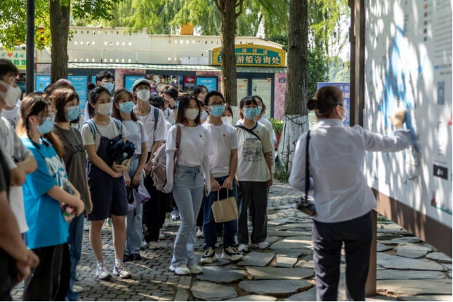 学生们乘坐观光车从湖光序曲出发,前往华侨城湿地公园、磨山“水下森林”、帆船基地等景点,东湖风景区团工委工作人员详细讲解了湿地生态保护理念、“退渔还湖”生态政策、“系统谋划、流域治理、规划引领”治理理念、东湖水环境提升工程等生态文明建设工作,让学生们沉浸其中的同时受教育、长才干。