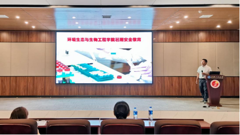 杨浩援引近年来高校实验室安全事故实例,向留校学生强调实验安全的重要性。同时,他结合学院实际情况,从实验室危化品管理、实验室操作规范、实验室突发情况自救办法等方面,向全体留校学生开展了一节贴合科研实践的实验室安全教育课。