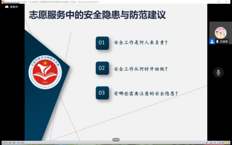 全国学校共青团研究中心的王丽莉老师,分别从“安全工作是何人负责?”“安全工作从何开始做?”“有哪些需要注意的安全隐患?”三个问题引入,为此次志愿服务中的安全隐患及其防范措施提出了建议,增强了青年志愿者的安全防范意识。