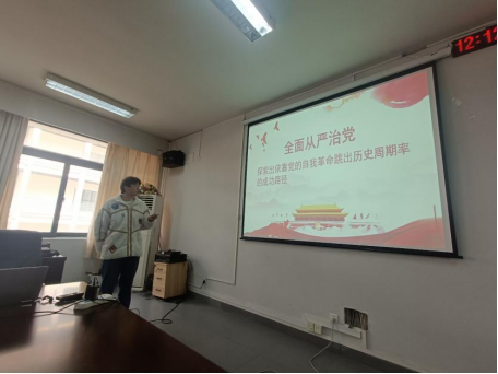 2020级环境科学专业学生党员陈志强为全体党员讲述关于“全面从严治党——探索出依靠党的自我革命跳出历史周期率的成功路径”的微党课,号召同学们学习从严治党有关精神,强化党的组织和政治纪律,自我审视,自我革新,更加紧密地团结在以习近平同志为核心的党中央周围,从学习、工作和日常生活方面出发,严于律己,更加自觉地坚定“四个自信”,做到“两个维护”为夺取全面建设社会主义现代化国家新胜利贡献力量。