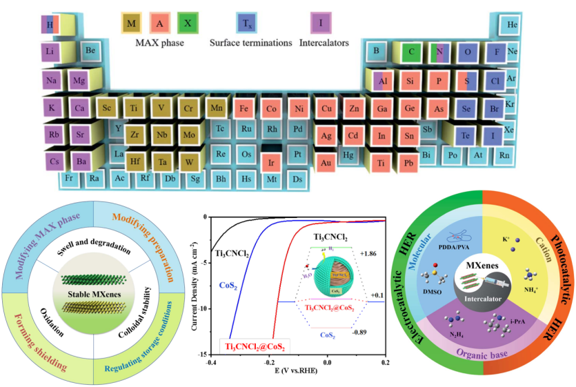 图1. MXenes成分分布的元素周期表及其稳定性、HER活性和插层的相关示意图。