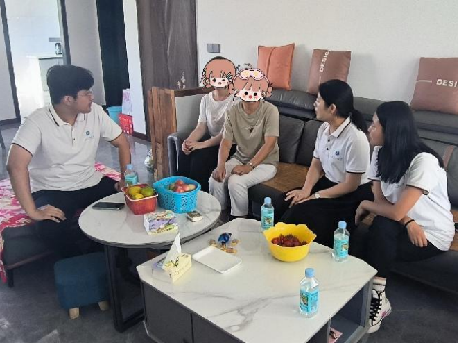 随后,大家来到2024级新生小骆和小戴家中。两家家长均表示,三四天前已经收到了录取通知书,能被武汉工程大学录取万分开心,还没报到老师们就来家里家访,充分体现了工大老师们的育人责任和关心关爱,非常放心把小孩送到工大读书。新生辅导员肖志昕分享了学院在帮助学生适应新环境、培养自主学习能力等方面的具体措施,并鼓励两位新生积极参与校园活动,尽快融入大学生活。郑冬洁介绍了学院人才培养计划以及近几年毕业生考研就业情况,对学生大学四年的学习、工作和生活提出了要求,希望能与家长形成协同育人共识,促进学生健康成长和全面发展。
