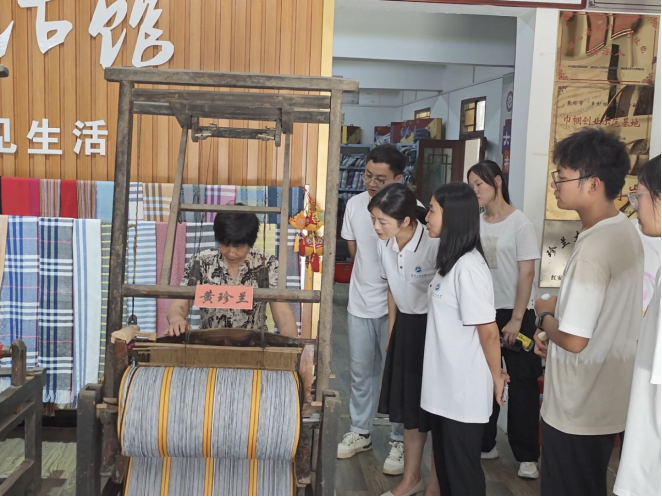 实践团走进红安县非物质文化遗产保护传承基地,感受红色革命历史与非遗技艺文化的碰撞。红安大布传统纺织技艺省级传承人黄珍兰大师向实践团介绍织布机的结构和运行原理,展示自己制作的改良版织布机。实践团成员积极参与体验传统手工艺,深入感受织布的魅力,零距离感悟红安大布制作技艺,全方位体验红安大布非遗文化,感受革命历史与当地文化的融合。这是与历史的互动,与红色温度背贴着背的精密接触,更是文化的传承与交融的集合。
