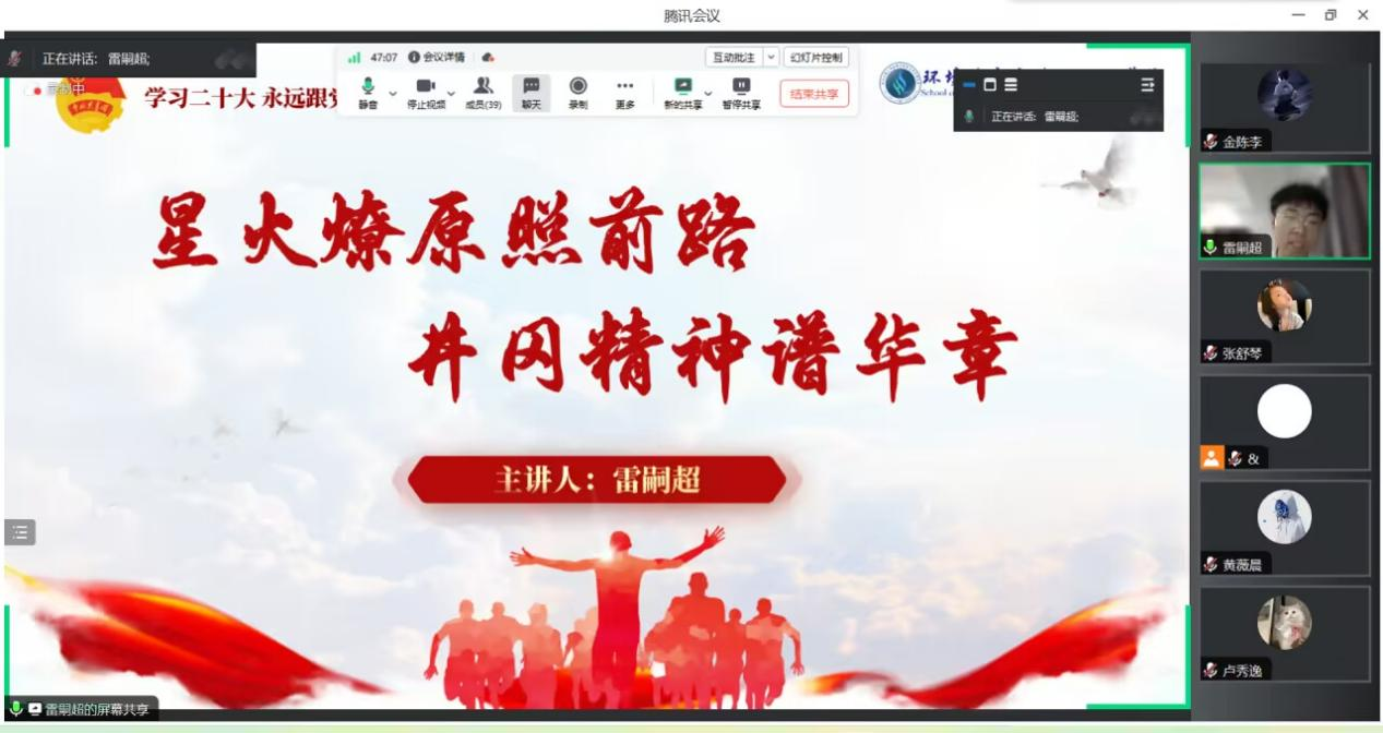 四庄中学学生代表、学院“暑假学堂”主讲人代表依次发言。随后,湖北省青马工程第十一期学员、武汉工程大学研究生支教团成员雷嗣超带来以“星火燎原照前路,井冈精神谱华章”为主题的开班第一讲。