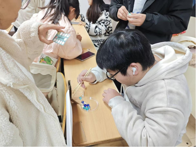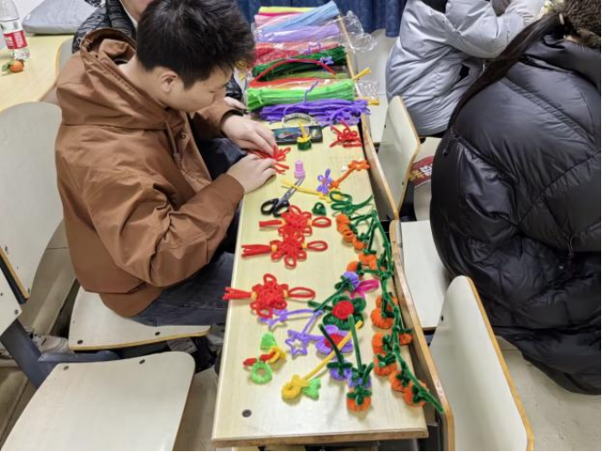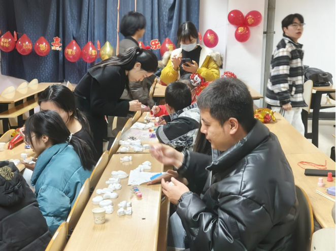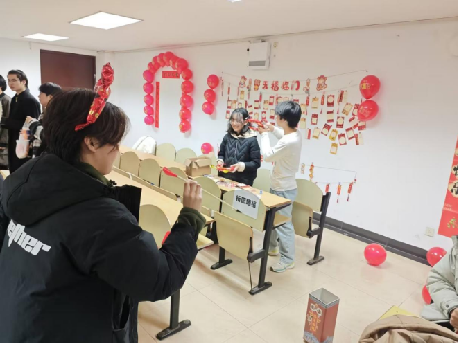 游园会现场也精心设置了丰富多彩的游戏环节,充分满足了不同师生的兴趣爱好。“DIY扭扭棒”区域充满了创意与想象;“创意涂娃娃”则让大家发挥绘画才能;“你画我猜”考验着团队之间的默契程度,欢笑声此起彼伏;“趣味投壶”带大家领略传统游戏的魅力;“‘害你’在心口难开”让现场充满了欢乐的“陷阱”与惊喜,大家在互相猜测与调侃中增进了感情;“新年祈福墙”承载着师生们满满的新年愿望,成为了希望的寄托之所;“环之有礼”的抽奖环节更是让大家期待不已,幸运的师生们收获了新年的第一份惊喜,每个游戏区域都人头攒动,热闹非凡。