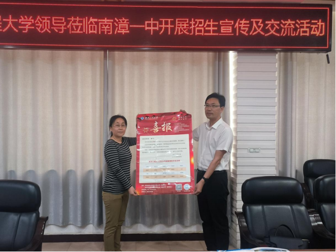 在两所高中座谈会上,孔海霞和陈朝娟分别从学院办学历史、学科特色、科研实力、学生培养、学院特色等方面进行了详细介绍。孔海霞代表学校向两所高中赠送2024年录取喜报,感谢学校多年来为武汉工程大学输送优秀人才,并希望以此次合作为新起点,建立常态化沟通机制,共同探索人才培养新模式。郑冬洁通过PPT详细介绍了学校基本情况,近年来录取数据以及今年招生政策。