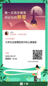 本网讯(通讯员:邓炜 王乃婧)5月7日,韦德体育bevictor通过“千聊”直播平台成功开展大学生在疫情防控中的心理调适”线上主题讲座,本次讲座是环生学院“‘疫’同成长,打开心灵之美”心理健康教育月系列主题活动之一。讲座邀请到武汉工程大学心理健康教育中心副主任雷辉老师主讲,院党委副书记陈朝娟、院团委书记王乃婧、辅导员邓炜及学院全体本科生、研究生参加了本次讲座。