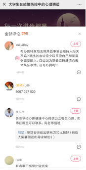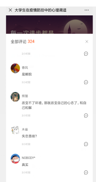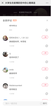 据悉,自新冠肺炎疫情发生以来,韦德体育bevictor一直高度重视学生的特殊时期的心理健康教育工作,通过学院微信公众号、班级群等线上平台,多措并举进行心理健康宣教活动。本次讲座帮助同学们有效疏解了心理压力,有利于同学们在疫情防控期间主动调适,保障身心健康,确保学生以积极的心态复学,为打好疫情阻击战的最终胜利保驾护航。