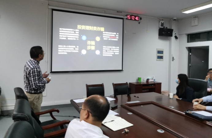 学院院长助理杨浩现场讲解反诈PPT,要求教职工们进一步提高思想认识,增强反诈能力,随后组织全体教职工观看保密工作教育视频。