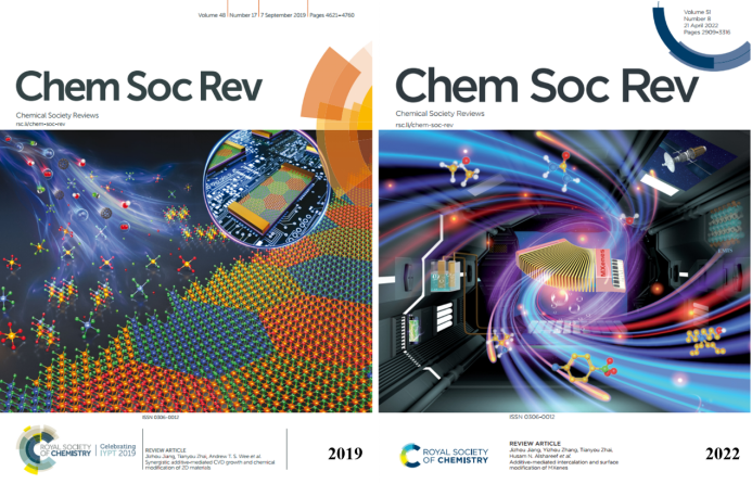 2019年8月,江吉周教授以第一作者,武汉工程大学为第一单位,首次在国际顶级学术期刊《Chemical Society Reviews》上发表了题为“Synergistic additive-mediated CVD growth and chemical modification of 2D materials”的综述论文,并被选为期刊的正封面论文。