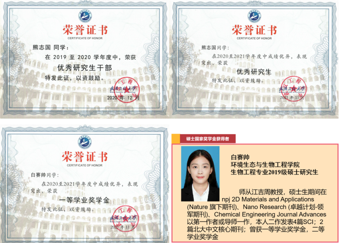 在他的指导下,白赛帅硕士期间共发表论文4篇SCI 论文 (其中3篇1区和1篇新刊),2篇北大中文核心期刊,1项发明专利,荣获“国家奖学金”;熊志国硕士期间共发表4篇学术论文 (其中1篇为1区SCI,且属于卓越计划-重点期刊),获“优秀研究生干部”、“优秀研究生”、“一等学业奖学金”等荣誉称号。江吉周认为,师生关系在某种程度上胜于父子关系和朋友关系。他希望学生在校期间获得丰硕的学术成果和扎实的实践能力,呼吁学生为步入社会、踏上工作岗位前储备充足的能量。