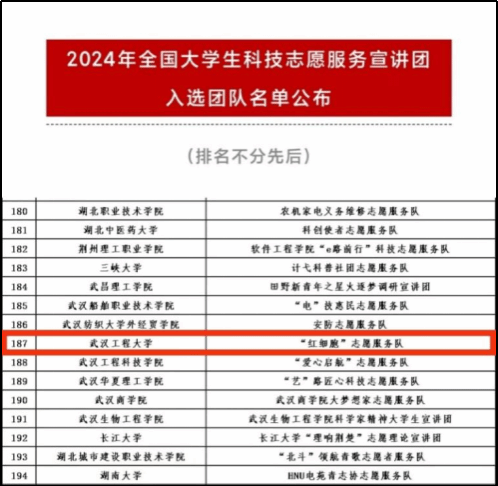 全国大学生科技志愿服务团队的遴选由中国青年志愿者协会、中国科学技术协会宣传文化部联合组织,旨在推动高校大学生科技志愿服务专业化、规范化和常态化开展,全国仅遴选300支。